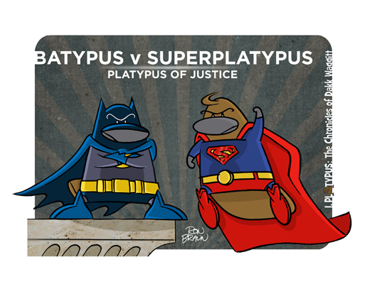 Part of a companion project to Once Upon A Platypus, this is one of a series of prints featuring the story’s co-star, a pudgy platypus named Dakk Waggitt, assuming the identities of various superheroes and movie icons. This one features Dakk as Batman and Superman in Dawn of Justice.