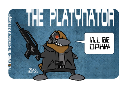 Part of a companion project to Once Upon A Platypus, this is one of a series of prints featuring the story’s co-star, a pudgy platypus named Dakk Waggitt, assuming the identities of various superheroes and movie icons. This one features Dakk as The Terminator.