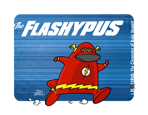 Part of a companion project to Once Upon A Platypus, this is one of a series of prints featuring the story’s co-star, a pudgy platypus named Dakk Waggitt, assuming the identities of various superheroes and movie icons. This one features Dakk as The Flash.