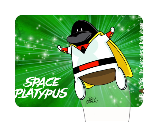 Part of a companion project to Once Upon A Platypus, this is one of a series of prints featuring the story’s co-star, a pudgy platypus named Dakk Waggitt, assuming the identities of various superheroes and movie icons. This one features Dakk as Space Ghost.