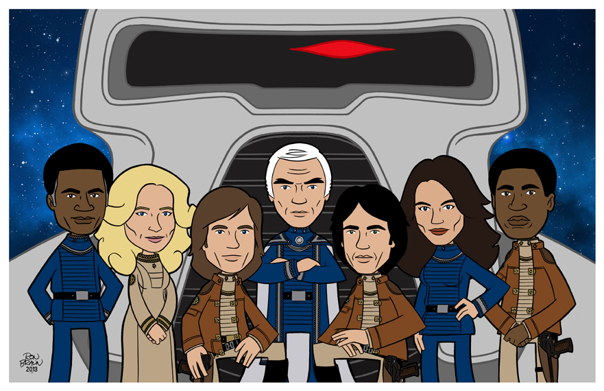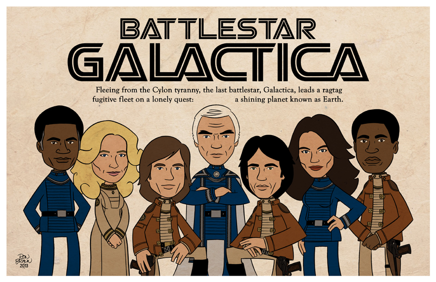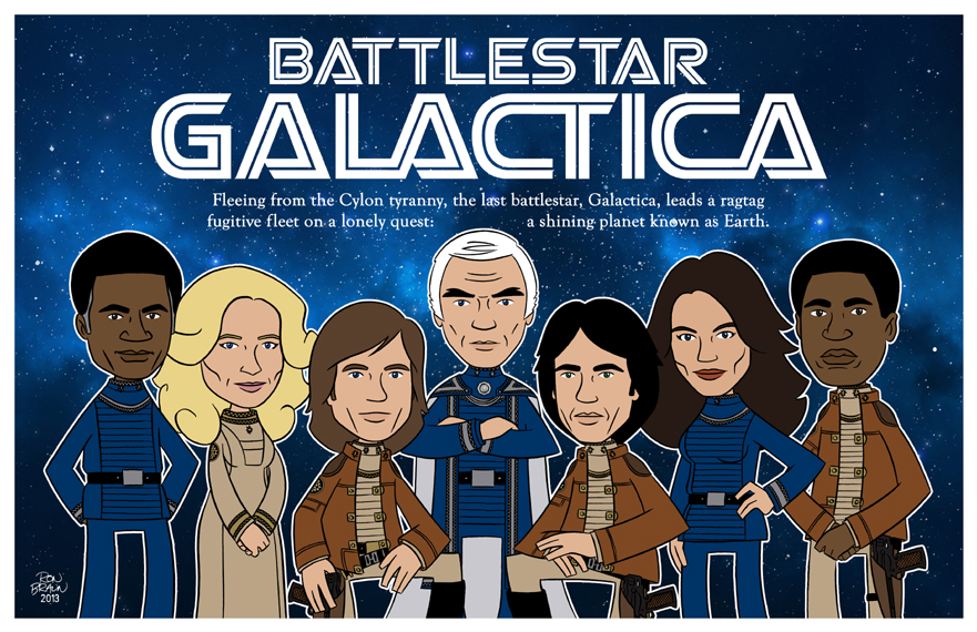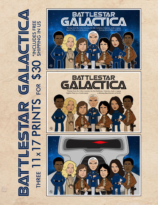 Created in 2018 for Battlestar Galactica's 40th Anniversary, these awesome prints are now for sale to the general public for the first time! What you get is a set of three exclusive 11 x 17 cartoon prints that feature seven of the cast members from the original Galactica TV-show from 1978.